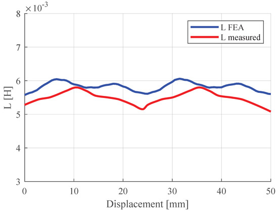 Additional measurements including the mover were made. As shown in Figure 21, the single-phase inductance value was slightly lower than the one obtained via 2D FEA simulations, about 0.2 mH less. It is worth noticing that the saliency ratio for the simulated machine and the prototype was nearly the same, equal to 1.12 for the prototype and 1.1 in simulations. In Figure 18, the complete 3D geometry of the prototype is shown.