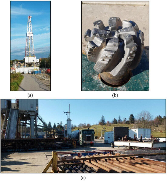 Drilling a deep borehole is a complex and time-consuming multi-stage process that involves several technically complicated steps. Initially, the drilling site is prepared via a number of important processes, including hardening the terrain to ensure stability (Figure 1a), allocating a sufficiently large area for technical facilities, including devices, machines, and allocating social and technical spaces for geological, supervisory, and technical drilling services (Figure 1c). Additionally, given that drills are subject to wear and tear, they must be replaced periodically with new and efficient drills (Figure 1b).