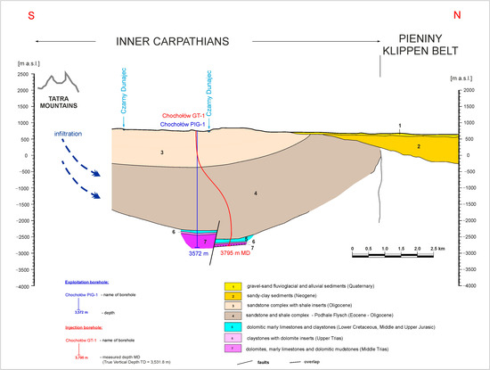 The Chochołów GT-1geothermal injection borehole, located in Eastern Europe, was selected as a reference borehole. The region where this borehole is located is rich in geothermal water, which is exploited via several deep boreholes and primarily used for heating and recreational purposes [24,25,26]. The Palaeogene Podhale Basin, where the Chochołów GT-1 well was drilled, is situated in the northern part of the Inner Carpathians, flanked by the Tatra Mountains to the south and the Pieniny Klippen Belt to the north (Figure 3). The subflysch aquifers in this area are replenished with rainwater originating from the Tatra Mountains [27,28], and infiltrating rainwater in this region moves northward through a system of cracks and karst voids, following the direction of the subsidence of the Tatra series. Additionally, mainstream surface water penetrates the depths of this region, heats up, and is eventually captured as thermal water by boreholes.