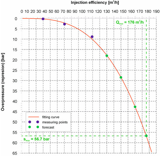 To determine the conditions suitable for injecting SGW into the rock mass at the absorption borehole, absorption tests were performed for the Chochołów GT-1 borehole using a three-stage system, as shown in Figure 10. First, the static pressure at the head of the borehole was determined to be 6.3 bar, consistent with that reported by Bielec and Operacz [29]. Next, based on the curve fitted to the measurement points, the overpressures for injection flow rates of 120, 140, and 160 m3/h were forecasted. Additionally, at a flow rate of 176 m3/h, the maximum overpressure (56.7 bar), approximately equal to the pressure at the head of the well (63 bar), was obtained. This pressure represents the maximum permissible head pressure at the head of the Chochołów GT-1 borehole.
