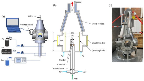 A laboratory-scale spray swirl-stabilized burner integrated into a high-pressure vessel was designed for the experiments, and the schematic of the combustor is depicted in Figure 1. The cylindrical combustion chamber, designed with an inner diameter of 200 mm and a total height of 400 mm, is capable of operating at pressures up to 2 MPa. The chamber is equipped with four quartz windows for flame observation and optical measurements. Within the chamber, a cylindrical quartz glass with a diameter of 170 mm and a height of 200 mm is placed, and nitrogen is introduced into the small holes around the glass to prevent contamination from soot and water condensation. The pressure of the chamber is monitored by a pressure sensor (Keller, 33X) with an accuracy of ±0.01% and controlled by a combination of a manual pressure valve and a digital PID controller.