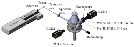 Since the fluorescence wavelengths of the PAHs are correlated with the molecular sizes of PAHs, the detection wavelength bands were determined based on [47,48]. Part A mounted a 386 nm narrow-band filter with FWHM of 27 nm (Edmund) to capture pyrene (A4) fluorescence. Part B of the stereoscope mounted a 340 nm narrow-band filter with FWHM of 26 nm (Edmund) to capture fluorescence of A2 and A3 both imaged by ICCD1 (emICCD, Princeton Instruments, PIMAX4). The ICCD2 (Princeton Instruments, PIMAX4) was equipped with a 525 nm narrow-band filter with FWHM of 25 nm (Edmund) to obtain the PLIF signals of acenaphthylene (A2R5) fluorescence. Details of cameras and filters are shown in Table 2.