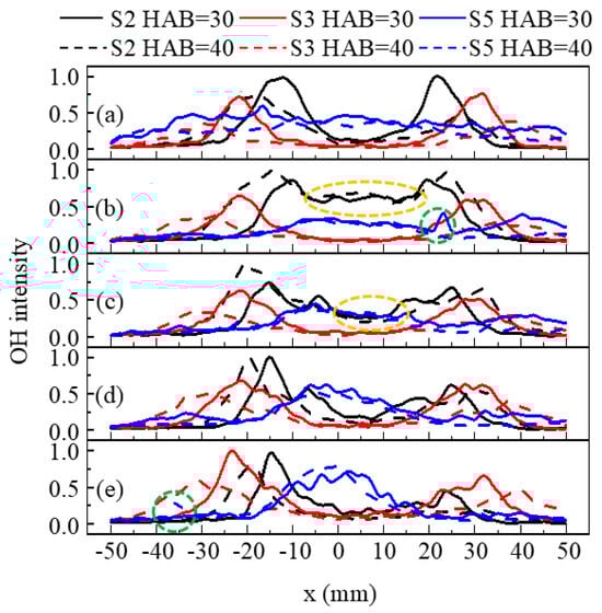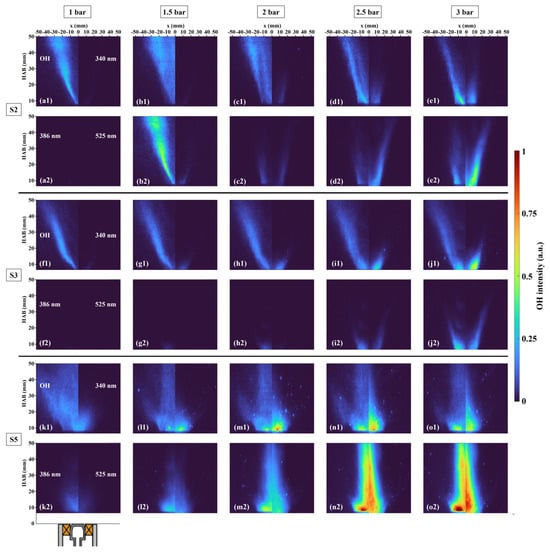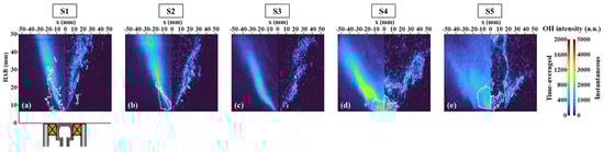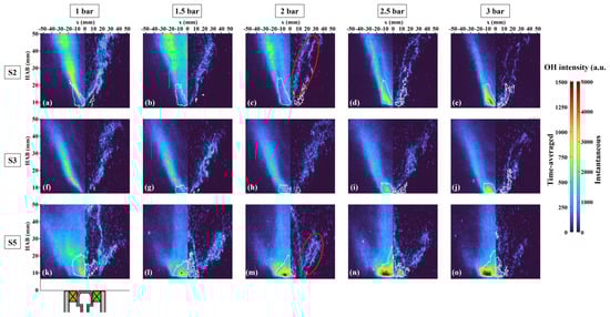 In the case of S2 and S3 (V-shaped flames), the OH was mainly distributed in the periphery of the spray jet near the nozzle, and four peaks emerged with increasing pressure corresponding to the bifurcation structure. However, in the case of S2, the OH signal appeared in the IRZ at 1.5 bar and 2 bar, as encircled by the yellow dashed line in Figure 6, corresponding to the time-averaged part of Figure 5b and differing from the instantaneous one. Upon a detailed observation of images for S2 at 1.5 bar, the distinct distribution of time-averaged OH signals was attributed to the flame instability. Furthermore, the comparable OH intensity for S2 at HAB = 30 mm and HAB = 40 mm revealed that with a smaller SN, the reaction zone extended downstream owing to the poorer mixing quality of droplets and air. The lower mixing quality impacted the evaporation rate of the droplets [50,51], resulting in a higher OH signal intensity observed at a greater HAB in most cases with smaller SN as shown in Figure 4 and Figure 5. Additionally, the flame angles remained unchanged with increasing pressure, since the radical positions of the maximum OH intensity at different pressures were almost the same.