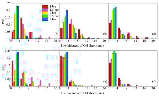 PDF of the thicknesses of OH layer at different pressures, (a,d) is S2, (b,e) is S3, (c,f) is S5. The upper row is at HAB = 30 mm, and lower row is HAB = 40 mm.
