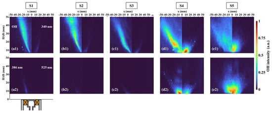 Time-averaged images of OH-PLIF and PAH-PLIF with different SN at 1 bar, and (a–e) correspond to the cases S1–S5. (a1–e1) show OH-PLIF (left) and PAH-PLIF at 340 nm (right). (a2–e2) show PAH-PLIF at 386 nm (left) and PAH-PLIF at 525 nm (right).