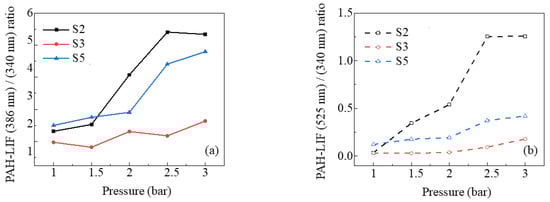 Ratios of maximum PAH-LIF signals for case S2, S3, and S5 as a function of pressure. (a) 386 nm/340 nm, (b) 525 nm/340 nm.