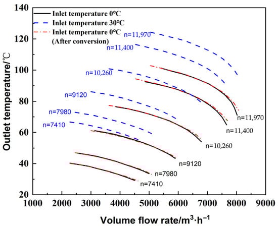 Through this equation, the exhaust temperature curves of two known working conditions are converted. Under the same pressure, the exhaust temperature curve with an inlet temperature of 30 °C is converted to an inlet temperature of 0 °C. The result is shown in Figure 1.