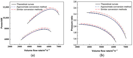 The result of variable temperature conversion (converting operating condition 1 to operating condition 2) is shown in Figure 3. The black line is the performance curve of operating condition 2, the red line is the performance curve of operating condition 2 obtained by converting the performance curve of operating condition 1 through the complete similarity conversion method, and the blue line is the performance curve of operating condition 2 obtained by converting the performance curve of operating condition 1 through the second-type approximate similarity conversion method. The conversion errors of the pressure ratio and power of the method used in this paper are all within 0.7%, so the conversion result can be considered good and is similar to the result of the similarity conversion method.