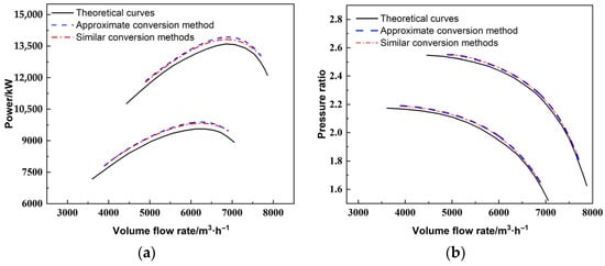 The result of variable pressure conversion (converting operating condition 1 to operating condition 3) is shown in Figure 4. The conversion errors of the pressure ratio and power of the second-type approximate conversion are all within 0.3%, while the conversion errors of the pressure ratio and power of the similarity conversion are close to 2%. Therefore, for the variable pressure operating condition, the effect of the second-type approximate conversion is significantly better than that of the similarity conversion.
