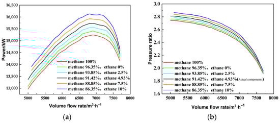 Figure 6a and Figure 6b are the compressor pressure ratio curves and power curves for different working fluid components under the same inlet conditions and the same rotational speeds, respectively. Here, the actual working fluid components, pure natural gas, and different methane–ethane ratios are selected for the study.