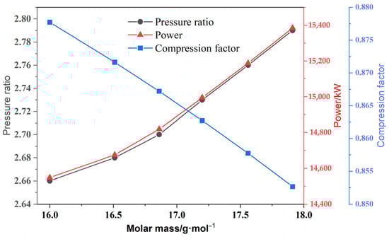 To further explore the influence mechanism of gas component changes on the compressor performance, calculate the compression factors of components under different molar masses, and select the working condition with a flow rate of 6000 m3/h for analysis, as shown in Figure 7. As the average molar mass of the mixed gas increases, the compression factor continuously decreases, and the gas is easier to compress, so the pressure ratio increases.