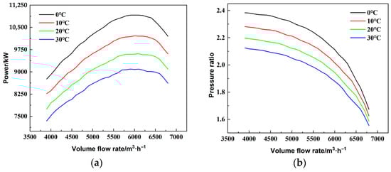 During the actual operation of the compressor, the inlet temperature will change with the seasons. For example, from spring to autumn, the inlet temperature of the compressor will gradually rise and then gradually fall. Research on the influence of inlet temperature change on the compressor has an important role in compressor performance evaluation and regulation [27,28]. Figure 8a and Figure 8b are the compressor pressure ratio curves and power curves at different inlet temperatures under the same inlet pressure and the same rotational speed, respectively.