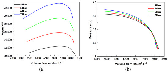 During the actual operation of the compressor the inlet pressure of the compressor will change continuously over time, and the change in inlet pressure will have a certain impact on the aerodynamic performance of the compressor [29]. By studying the performance changes under different inlet pressures, the best operating conditions can be found to maximize the efficiency and output power of the compressor. At the same time, it also helps to develop reasonable operation and maintenance strategies to avoid safety accidents caused by pressure fluctuations. In addition, through in-depth research, customized compressor design and operation schemes can be provided for different application scenarios to meet diversified needs. Figure 9a is the performance curve of the compressor pressure ratio under different pressures under the same temperature and rotational speed conditions, and Figure 9b is the performance curve of the compressor power under different pressures.