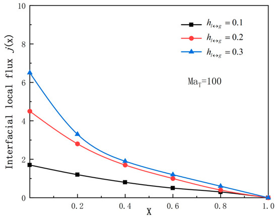 In addition, the area between each curve and the horizontal axis represents the total evaporation flow rate J (integrated evaporation flow rate) on the phase-change interface. It can be seen from the above analysis that in the weakly heated capillary convective liquid layer, the local mass flow rate at the interface is mostly augmented with the increase in ; therefore, the total evaporation J also increases monotonically with . In the liquid layer with a certain intensity of thermal capillary convection, the change law of local mass flow j is divided into three different areas, and the local mass flow J in two areas no longer monotonically increases with . There may exist a large liquid layer where the total evaporation flow rate J is smaller than that of the small liquid layer. The contribution of thermal capillary convection in the evaporation layer to the total evaporation flow is shown in Figure 12.