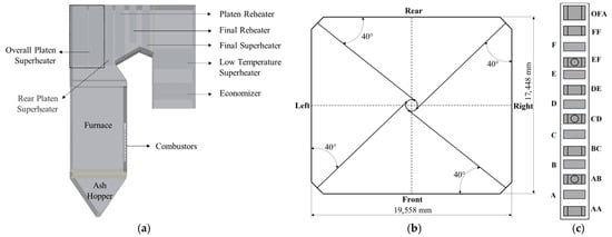 The main components of the furnace include an ash hopper, furnace, overall platen superheater, rear platen superheater, platen reheater, final reheater, final superheater, low temperature reheater, and economizer. The water-cooled wall and heat exchangers at all levels are simplified without thickness. The physical model is established according to the boiler’s physical construction. The overall structure is displayed in Figure 1.