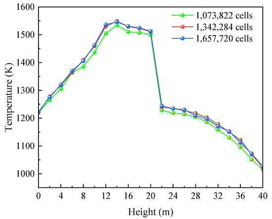 Several groups of models with separate numbers of meshes are selected for grid-free verification, and the uniform temperature of the horizontal interface at each height is observed (as shown in Figure 3). From the figure, the trend in average temperature at the horizontal interface of the furnace under several sets of grids is the same as that of the height. The simulation accuracy of the two sets of grids, with the number of grids of 1,342,284 and 1,657,720, is high. However, as the mesh becomes denser, compared with the grid group with the number of grids of 107,382, the calculation time and the computational resources will also increase. Considering the calculation accuracy and the computational resources consumed, this study selects the model of 1,342,284 grid for simulation.