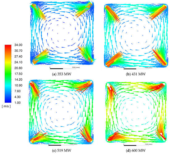 Figure 4 exhibits the air flow velocity distribution in the cross-section of the furnace nozzle under different loads. A tangent circle is created in the furnace by the four-corner airflow. The tangent circle’s diameter is larger than the imaginary tangent circle’s diameter. And the low-speed zone in the furnace is presented, which conforms to the general law of the four-corner tangent circle. As the boiler load goes up, the air flow velocity escalates significantly. Under the load of 353 MW, the maximum and minimum flow velocities of air flow on the cross-section are 12.7 m·s−1 and 0.426 m·s−1, respectively. When the load increases to 600 MW, these parameters escalate significantly, with maximum velocity reaching 33.2 m·s−1 and minimum velocity rising to 1.78 m·s−1. This substantial increase in velocity magnitude has profound implications beyond flow structure. Higher velocities generally reduce particle residence time within specific furnace zones. However, the observed development of a more coherent circular pattern and the ~15% expansion of the tangent circle diameter (from 353 MW to 600 MW) indicate a crucial compensating effect. The enlarged rotational flow path effectively increases the overall trajectory length for particles and gases within the core combustion zone before they exit upwards. As the load went up from 353 MW to 600 MW, the tangential airflow in the furnace developed a more coherent circular pattern, with the tangent circle diameter expanding by approximately 15% due to intensified rotational momentum and enhanced aerodynamic symmetry under higher operating conditions. Increased fuel and air supply is accompanied by enhanced combustion reactions, generating greater flue gas production. This elevated mass flow rate directly increases gas velocity within the furnace. The resulting higher flow momentum causes the rotational airflow pattern to expand radially, thereby enlarging the tangent circle diameter. This expansion is beneficial for combustion efficiency at high load. The larger tangential circle improves the spatial distribution of combustion, promoting better mixing of fuel and air across a wider central area of the furnace. This enhanced mixing mitigates localized oxygen deficiency and leads to a more uniform temperature distribution radially. Consequently, while peak gas temperatures might not increase linearly with load, the volume of the furnace effectively utilized for combustion increases, contributing to higher overall heat release and more uniform heat flux distribution on the furnace walls. The observed velocity increase, coupled with the larger tangent circle, suggests a more vigorous and well-distributed combustion process at 600 MW, likely translating to improved burnout rates. As shown in Figure 4, airflow streamlines exhibit tangential distribution with rotational characteristics. This pattern is formed through aerodynamic interactions between adjacent combustion jets, creating directional modifications in horizontal velocity distribution.