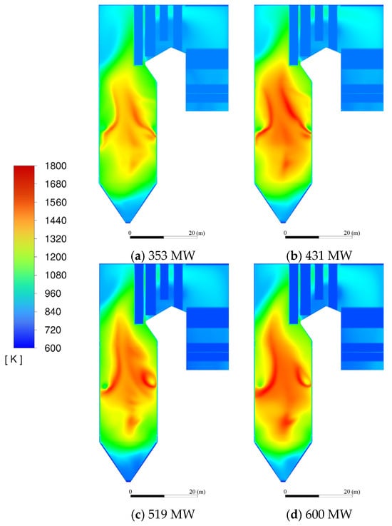 Figure 5 indicates the gas temperature distribution of the boiler center longitudinal section. As the load grows, the overall temperature level rises notably, and the high-temperature zone’s range expands. Under the load of 353 MW, the high temperature area accounts for about 1/2 of the furnace area, and the maximum temperature is 1.75 × 103 K. When the load reaches 600 MW, the maximum temperature does not change significantly, but the high temperature zone almost occupies the entire boiler interior, so the overall temperature rises markedly. This significant expansion of the high-temperature zone volume at 600 MW, despite a stable peak temperature, indicates a substantial increase in the furnace’s effective heat release capacity and a more uniform thermal load distribution radially. To meet the higher load demand, the working intensity of the boiler burner rises, the combustion rate accelerates, the fuel supply grows, and the release of heat from the combustion increases, which makes the volume of the primary zone expand. The temperature rises with height. It increases at the lower height and then decreases gradually at the higher height. This is owing to the absence of fuel combustion in the ash hopper area at the lower part of the furnace, so the temperature is significantly cooler than the temperature in the primary zone. As the height rises to the main burning area of the boiler center, the gas flow and the pulverized coal are fully mixed and burned violently, leading to an evident temperature growth in this area and the burner zone. While the height rises to the burnout area, the supply of air and pulverized coal is insufficient, and the combustion intensity is weakened. Meanwhile, the water-cooled wall’s heat exchange in the furnace makes the temperature continue to decrease, so the temperature gradually decreases. The temperature generally presents a “low-high-low” distribution. The gas temperature distribution above the primary zone in the figure adopts an obvious hump shape. Considering the gas velocity distribution in the transverse section, the reason lies in the boiler’s middle part is the most uniform zone of airflow distribution. The flue gas movement is stable, while the flow rate is moderate. Furthermore, the unburned pulverized coal and the oxygen provided by the overfire air are fully blended during the rising process. Different from the area near the furnace wall, it will not be subject to wall friction and water wall cooling, so it continues to burn in the central area and eventually generates a high-temperature region. With the surrounding wall unremittingly assimilating the flue gas heat, a significant decline in the outer air temperature and a mild decline in the inner air temperature. Finally, a hump-shaped temperature distribution is formed above the primary zone. This characteristic hump profile, sustained by central combustion intensity and peripheral cooling, directly shapes the longitudinal heat flux distribution on the furnace walls, typically exhibiting a peak corresponding to this high-temperature core zone.