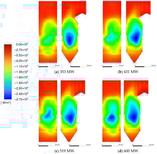 Figure 6 shows the heat flux distribution across the facing wall and the lateral wall of the boiler. The wall heat flux is negative, indicating that the wall is in an endothermic state, and the heat exchange in the boiler is dominated by radiant heat exchange. This dominance of radiation is further supported by the observed high-temperature zones within the furnace core, as radiant heat transfer scales strongly with the fourth power of absolute temperature. Higher absolute values of wall heat flux correspond to enhanced heat transfer rates and increased thermal energy absorption by the furnace wall. The figure shows that the heat absorption distribution on the furnace wall is positively correlated with the boiler load. The main factor is that when the boiler load increases, the air temperature level also rises, which consequently impacts the water-cooled wall heat absorption distribution. Under 353 MW load, the furnace wall’s maximum heat absorption is 2.29 × 105 W∙m−2. As the load goes up to 600 MW, the maximum heat absorption increases to 2.75 × 105 W∙m−2. The observed thermal absorption enhancement is primarily attributed to elevated combustion air temperatures governed by boiler load increments. Maximum furnace wall heat flux measurements demonstrate load-dependent characteristics, with values rising from 2.29 × 105 W∙m−2 at 353 MW to 2.75 × 105 W∙m−2 under 600 MW operation. The combustion between the horizontal plane of the primary air AB nozzle and the overfire air nozzle is the most intense, so the temperature level of this part is high, and a large amount of radiant heat is diffused around. This region corresponds to the peak heat flux observed along the furnace height, highlighting the direct link between localized combustion intensity, gas temperature profiles, and wall heat absorption patterns. Accordingly, the elevated thermal intensity in the furnace’s central zone enhances the radiant heat exchange between adjacent water walls significantly. While the ash-cooled hopper and the area above the flame angle have lower temperatures, the amount of radiation is less, and the water-cooled wall’s heat absorption is consequently lower. The side wall heat flux distribution shows asymmetry, as seen in the figure. This uneven pattern is caused by non-uniform mixing of pulverized coal and air flow in different furnace zones, which directly influences combustion efficiency. The distribution of heat flux can be improved by monitoring in real time to maintain combustion stability and adjusting operating parameters in time. Such mixing non-uniformity can lead to localized variations in oxygen concentration and temperature, creating pockets of differing combustion intensity that manifest as the asymmetric heat flux distribution on the walls.