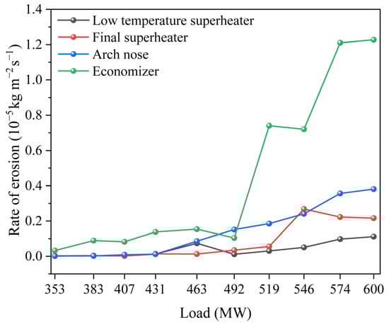 Pipe wear on the heating surface of a coal-fired boiler is a main problem affecting the stable operation and safety of a coal-fired boiler. A large amount of ash is produced during the operation of the boiler by coal combustion flows with the airflow, causing a severe impact on various components in the furnace. The results of numerical simulations show that the most severely worn heating surfaces in the boiler are the low temperature superheater, final superheater, flame angle, and economizer. The severe wall wear in these areas is caused by the unequal distribution of ash particles, the high flue gas flow rate, and the rapid movement of ash particles. These critical wear zones often correlate strongly with regions of high local gas velocity (Figure 4), significant particle concentration, or where complex flow patterns (like the intense tangential rotation in the upper furnace near the flame angle) direct particles towards the walls. The maximum wear rates for these parts are summarized in Table 8. As the load grows, the maximum wear rate of the low-temperature superheater rises from 1.23 × 10−8 kg·m−2·s−1 to 1.12 × 10−6 kg·m−2·s−1, and the wear rate of the final superheater, flame angle, and economizer also rises. The primary reason is that increased boiler load enhances airflow, increasing jet velocities and overall gas movement in the furnace. This directly raises the speed and kinetic energy of coal/ash particles carried by the airflow. Under the action of inertia, the impact force generated when these particles collide with the internal parts of the furnace increases, and the probability of secondary collision of solid particles with the components increases, resulting in an amplification in the maximum wear rate of each component. Furthermore, elevated temperatures at higher loads (Figure 5) may slightly soften ash particles or alter their viscoplastic behavior, potentially influencing their erosion characteristics upon impact, although the dominant factor remains the kinetic energy increase. As demonstrated in Figure 7 that the maximum wear rate of the economizer is the fastest at all loads. It is 3.29 × 10−7 kg·m−2·s−1 at 353 MW load and 1.23 × 10−5 kg·m−2·s−1 at 600 MW load. The maximum wear rate increases by nearly 40 times. This stems from the fact that the wear rate exhibits direct proportionality to the square of flue gas velocity, almost. The economizer is located in the tail flue of the boiler with a small cross-sectional area. Higher boiler duty makes the flue gas velocity rise rapidly, so the wear rate escalates more. Spatial erosion distribution (Figure 8) with velocity contours would vividly illustrate how the highest wear zones in the economizer align precisely with the highest velocity channels. While the overall airflow velocity rises, especially close to the furnace wall significantly increases, it may cause the flame to wash the wall, which in turn makes the furnace surface slagging and the wear of the components in the furnace, resulting in the wall thinning, affecting the boiler’s performance and safety, jeopardizing the boiler’s safe operation. This “flame washing” effect is particularly detrimental in areas like the flame angle, where the intense tangential flow patterns (Figure 4) can concentrate high-velocity particle-laden streams against specific wall sections, leading to localized severe wear. To effectively reduce the wear, the following control measures can be taken: regular cleaning of the furnace ash, increasing the dust removal equipment, reducing the density of solid particles in the exhaust gas; install anti-wear cover or anti-wear plate in the wear-prone area; thermal spraying technology is applied on the surface of wear-prone parts to enhance their wear resistance.