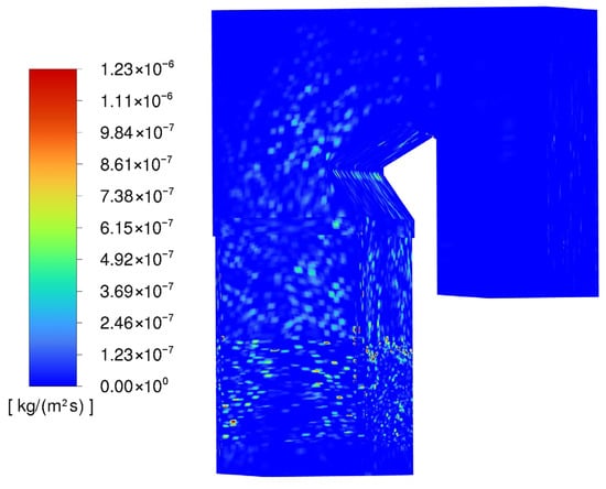 The Lagrangian discrete phase model was employed to simulate pulverized coal particle trajectories. The coal particle size distribution followed a Rosin–Rammler distribution with a minimum diameter of 0.01 mm, a maximum diameter of 0.25 mm, and a mean diameter of 0.056 mm. The spread parameter (polydispersity index) was set to 1.5, and the particle sizes were discretized into 10 groups to resolve polydisperse characteristics.