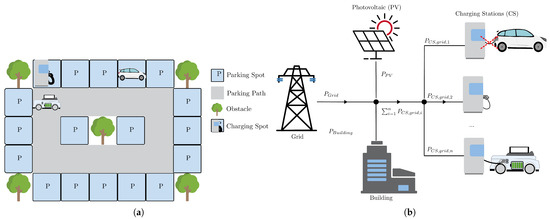 Overview of simulation environment: (a) Parking area where MCRs and EVs are located. (b) Power balance within the simulation environment.