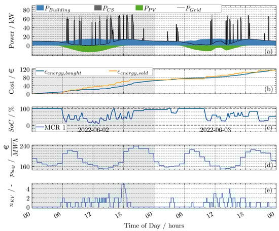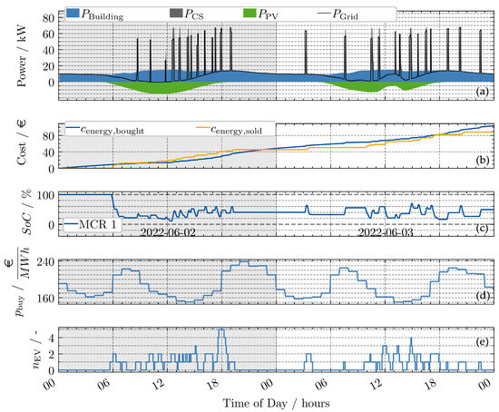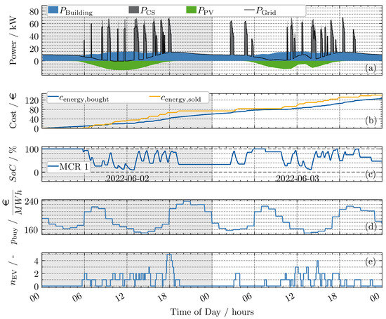 In the top graph (a), the power balance, including contributions from the charging stations (CSs), the building, and the PV array, is shown. Over the two-day period, 26 recharging events are identified by the spikes in , which also affect the grid power . In the bottom graph (e), the number of EVs present in the parking area is depicted. It can be observed that a maximum of five EVs are present at any given time, with the highest occupancy occurring between 12:00 h and 18:00 h on both days. Notably, EV arrivals are sparse during the nighttime hours. In graph (c), the state of charge (SoC) of the MCR is shown. Upon the arrival of the first EVs, the MCR discharges down to 20% SoC. Subsequently, the SoC fluctuates between 10% and 50%, reflecting the brief charging and discharging periods. Even during the night, when no EVs arrive for several hours, the SoC remains around 40%. The cost structure, based on accumulated revenue from energy sold and electricity costs , is displayed in plot (b). It is observed that during the first day, temporarily exceeds ; however, after 19:00 h, as EVs are no longer present and building power persists through the night, remains above . The increase in is significantly higher on the first day compared to the second day, primarily due to the starting SoC of 100% and higher, more stable PV power. By the end of the second day, the difference between and results in a profit of EUR −15.29.