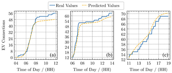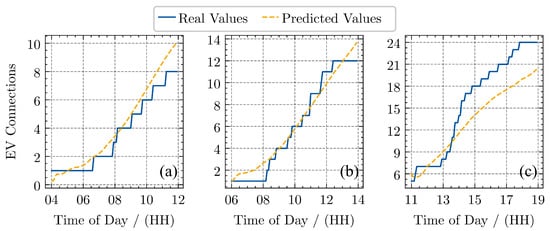 In graph (a), the prediction is conducted at 04:00 h on 24 February 2020. The input consists of the sin/cos encoded day of the week and time of day. Additionally, the input for the accumulated EVs is zero, as no EVs have connected to the charging stations up to that point. At around 05:00 h, EVs begin to arrive, and between 06:00 h and 08:00 h, there is a sharp increase in the number of connected EVs. The forecast tracks this increase very precisely; however, the final value of 56 EVs at 12:00 h is slightly underestimated (48 EVs predicted). For the second date, between 06:00 h and 14:00 h, the prediction quality improves further, though a slight underestimation persists. For the third day, where the prediction is made at 11:00 h for the following 8 h, the forecast slightly overestimates the number of connected EVs.