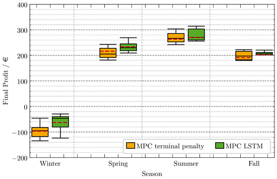 By comparing the two approaches, it can be observed that the mean profit is highest for the MPC LSTM throughout all seasons. However, especially for the summer and fall scenarios, the difference between the summer and the fall scenario is not significant. In the fall scenario, the best run with a terminal penalty shows an even higher profit than the MPC LSTM approaches’ corresponding run.