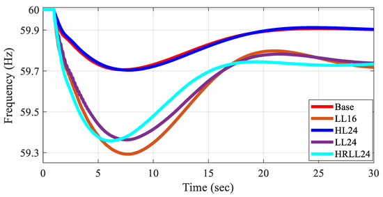 Figure 2 presents the average bus frequency responses for the test cases under an N-2 contingency scenario involving the outage of the largest generators, using dynamic models developed with the proposed method. Table 3 summarizes the frequency response characteristics. When IBRs are modeled as negative loads, the differences in frequency behavior among LL16, LL24, and HRLL24 cases are often not clearly captured, particularly when system inertia remains similar and low while IBR penetration levels vary. Furthermore, applying the method from [17,19] to systems with high IBR penetration does not guarantee stability and typically requires significantly more effort to achieve acceptable dynamic performance.