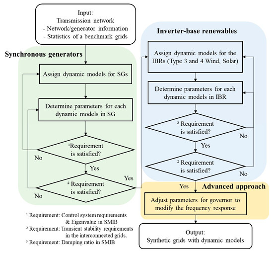 The process begins by selecting appropriate dynamic models for each generator based on its fuel type covering both SGs and IBRs. For each SG, the parameters of the machine, exciter, governor, and stabilizer models are determined using statistical data from actual benchmark grids, while also satisfying control system and individual model design requirements. Eigenvalue analysis in SMIB system is then conducted to ensure all generators exhibit stable dynamics. Subsequently, transient stability is evaluated in the full multi-machine system, with IBRs modeled as negative loads. If the system performance does not meet the predefined criteria, the algorithm iteratively reselects and adjusts the model parameters.