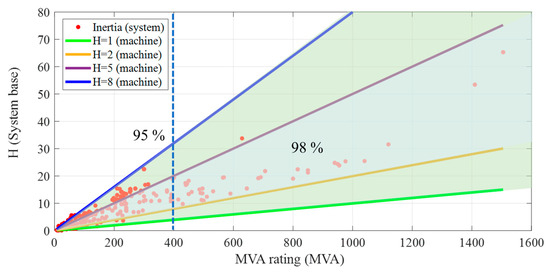 For a realistic inertial response, inertia is assigned to generators based on the correlation between MVA rating and the inertia constant. An example of the GENROU machine’s relationship between inertia and MVA rating in the benchmark actual grids is illustrated in Figure 4. Red dots are the data of system-based inertia constants, and solid lines represent the guidelines of machine-based inertia. Among generators with an MVA rating smaller than 400 MVA, 95% have a machine-based inertia ranging between 1 and 8. Similarly, among generators with an MVA rating larger than 400 MVA, 98% have machine-based inertia ranging between 2 and 5. Inertia is determined within these boundaries. By defining system inertia within these limits, various levels of system inertia cases can be generated.