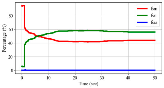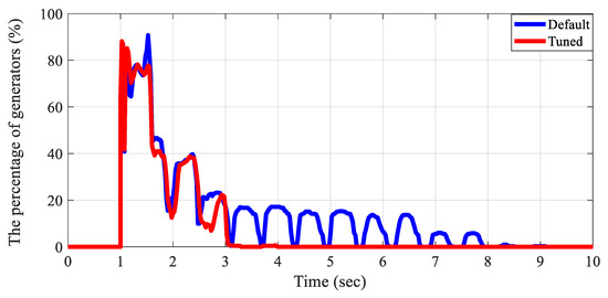 Specifically, the GGOV1 model uses three signals to control the valve position [25]. The first signal, “fsrn,” is the droop signal related to normal operation. The other two signals, “fsra” and “fsrt,” represent the acceleration controller and the temperature limit controller, respectively. The lowest value among the three signals is selected for the valve position. Figure 6 shows the percentage of generators exhibiting the lowest control signals in the test grids during a 50-s time-domain simulation following a generator outage event. As time progresses after the disturbance, the proportion of generators operating under normal conditions represented by the “fsrn” signal (red line in Figure 6) gradually decreases. In contrast, the percentage associated with the “fsrt” signal (green line in Figure 6), which corresponds to the temperature limit controller, increases. Specifically, the signal “fsrt” sets the limit based on the per unit maximum load value, as specified by the load limiter reference value. Analysis of the benchmark actual grids shows that the per unit limiter reference value is set to 1.0 for the large majority of gas turbine-governor models.