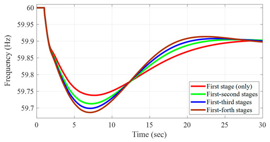 The impact of the contribution of each stage on the overall frequency response during a generator outage event.