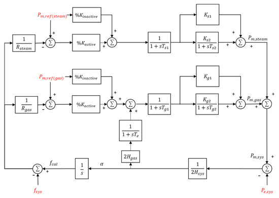 The system-wide governor model aggregates the behavior of gas and steam turbines, incorporating droop control, fast response, and slow response components. Each part is represented as Equations (2)–(5), where is the sum of the reference powers in each model, is the system’s nominal frequency, is the aggregated droop constant, and are the fast and slow time constants, and are proportional gains for fast and slow response.