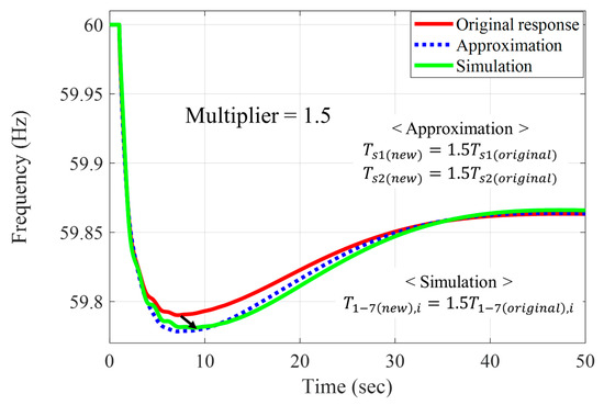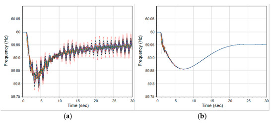 Some parameters also highly affect the overall frequency response. The proportional gain () and integral gain ) in gas turbine-governor models highly contribute to the overall frequency response. The impact of the increase of these PI gains (, ) on the test grid is described in Table 5 which presents the sensitivity to PI gain variations. Each PI gain is increased by 50% relative to the sum of the current PI gains. As shown in the results, the impact on settling time is smallest when the ratio of to remains constant. To preserve similar settling time characteristics as those observed in the benchmark actual grids, this ratio is fixed to the average ratio obtained from the benchmark statistics. Within this constraint, is selected from a practical range between 1 and 10. Additionally, tuning methods based on the Ziegler–Nichols (ZN) approach can be applied for refining the gain values [26,27].