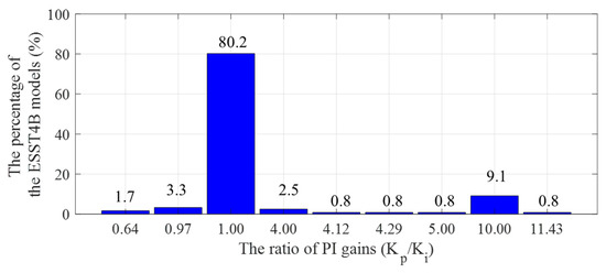 Each exciter model features distinct control mechanisms, such as lag-lead filter, rate-feedback, or PI control. The control structures used in each model are analyzed based on statistical studies from the benchmark grid. For instance, although the generic ESST4B model allows for a dual-PI configuration, all ESST4B models observed in the benchmark actual grids utilize a single PI control loop. Additionally, 80% of these ESST4B models use identical proportional and integral gains, as shown in Figure 10.