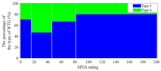 The generic models for IBRs and their combinations have been developed for positive sequence simulation and discussed in [36,37,38], depending on whether the generation is from solar, Type 3 wind, or Type 4 wind. The adequacy of Type 3 and Type 4 wind turbines based on their MVA rating in actual grids is illustrated in Figure 11 [19].