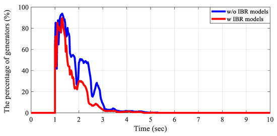 The exciter and IBR models, along with their parameters, are further validated through the transient stability perspective under event conditions. Figure 12 demonstrates that the exciter tuning process in the interconnected test grid improves the system’s ability to maintain synchronism and restore voltage to its operating point after a contingency. The percentage of generators exhibiting a voltage deviation greater than 0.5% from the operating voltage is analyzed under a solid three-phase balanced fault and clear scenario. When using the default parameters suggested by a commercial tool for the exciter models, oscillations are observed, and all generators converge to the operating point 8–9 s after the fault. Otherwise, after tuning the exciters, every generator converges to the operating point within 3 s after the fault. Similar to exciter validation, the IBR dynamic models in the interconnected test grid are validated through scenarios that compare voltage responses without and with tuning IBR dynamic models under the same contingency. In the case without IBR dynamic models, IBRs are assumed to be negative loads in the dynamic simulation. As shown in Figure 13, IBR dynamic models help the voltage performance converge to the operating points faster.