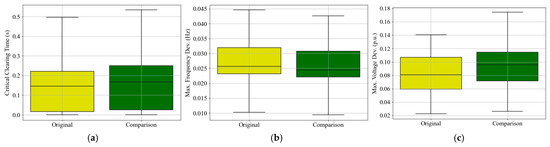 Box plot of the dynamic performances of two different synthetic cases for similarity comparison: (a) critical clearing time; (b) maximum average frequency deviation; (c) maximum average generator terminal voltage.