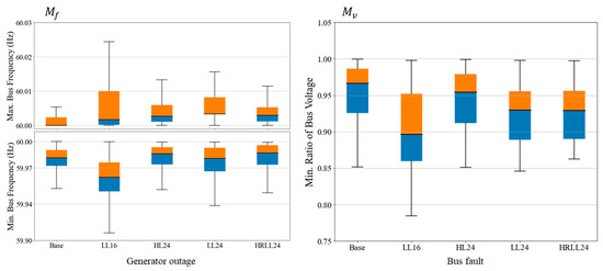 The dynamic performance of the five cases is evaluated using transient stability metrics specified in prior reports [42,43]. These metrics include the minimum and maximum bus frequency values (), as well as the minimum ratio of bus voltage to its pre-contingency level (). The specific performance requirements are summarized in Table 7 [17]. Two types of N-1 contingencies are analyzed: generator outages (for frequency evaluation) and bus faults (for voltage performance). For the bus fault scenarios, a three-phase solid fault is applied and cleared after three cycles. Full dynamic simulations are conducted for each N-1 contingency across the five cases, and the corresponding transient stability metrics are computed. Figure 16 presents box plots summarizing the statistical results of the N-1 contingency analysis. The results confirm that the dynamic performance of all five cases satisfies the defined stability requirements.