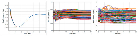 The dynamic performances are validated under a severe contingency involving the outage of the two largest generators, resulting in a total generation loss of 2708 MW. The simulation result of Base case with the bus frequency, bus voltage, and rotor angle profile are illustrated in Figure 17. The transient stability metrics indicate a well-behaved system response: the frequency stability metric remains within the acceptable range of [59.7, 60] Hz, and voltage stability metric, is 0.97, confirming a stable frequency and voltage recovery satisfying the requirements in Table 7. Notably, the average bus frequency response after the same contingency in five cases was illustrated in Figure 2 and Table 3, demonstrating robust system-wide performance under severe event.