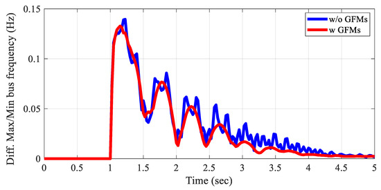 Although all cases show stable frequency responses, increasing the generation of IBRs while de-committing SGs weakens the grid stability under contingency situations. In LL24 case, which represents an IBR-heavy and low-inertia scenario, high frequency oscillations occur after the contingency. As a solution, GFMs can improve stability in an IBR-heavy grid. In Figure 18, the difference between the minimum and maximum bus frequencies at each time point illustrates the high frequency oscillations in LL24 case and the mitigated oscillations with the addition of GFMs. Notably, only two GFMs (MVA rating: 100 MVA) are added to the IBR-heavy area.