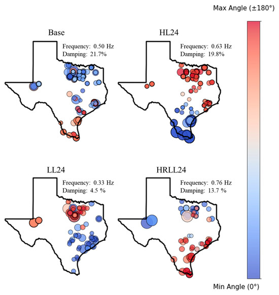 Using the test cases, inter-area oscillations in the Texas synthetic grids are studied. To extract the oscillatory modes, the Iterative Matrix Pencil method is employed within the PowerWorld Simulator. In LL16 case, there is no clear inter-area mode, but the other cases show a distinct inter-area mode related to the north and south areas. These inter-area modes are illustrated in Figure 20. The size of the circle represents the relative magnitude of the mode, while the color indicates the angle of the mode. LL24 case’s inter-area mode has the smallest damping at 4.5% with a frequency of 0.33 Hz, while the other cases have sufficient damping, greater than 10%.