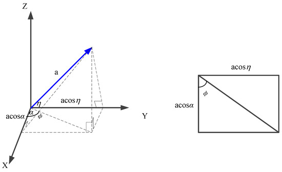 Firstly, the nadir attitude coordinate system is rotated around the Z axis, to make the +X axis reach the projection of pointing vector on the XOY plane. Assuming the angle between pointing vector and +X axis of nadir attitude coordinate system is α, the angle between the pointing vector and +Y axis of the nadir attitude coordinate system is η, and the angle between the pointing vector and +Z axis is γ, the yaw angle φ can be described as shown in Figure 2. In this Figure, a denotes the unit vector of the pointing vector.