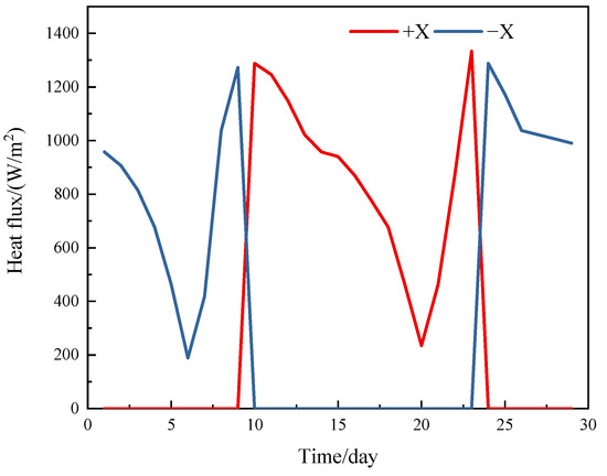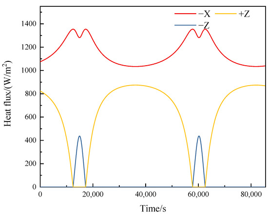 From Figure 6, Figure 7 and Figure 8, it can be seen that the reaching solar heat flux on different surfaces is significantly influenced by the angle of β. When β = 0°, the maximum solar heat flux on ±Z plane is greater, but the mean value of a period on the +Z plane is greater when β = 56° and on the −Z plane it is greater when β = −56°. Solar heat flux varies more violently when β = 0°, and is greater when β = ±56°. Additionally, the variety of solar heat flux on the −X plane is the same when β = −56° and β = 56°.