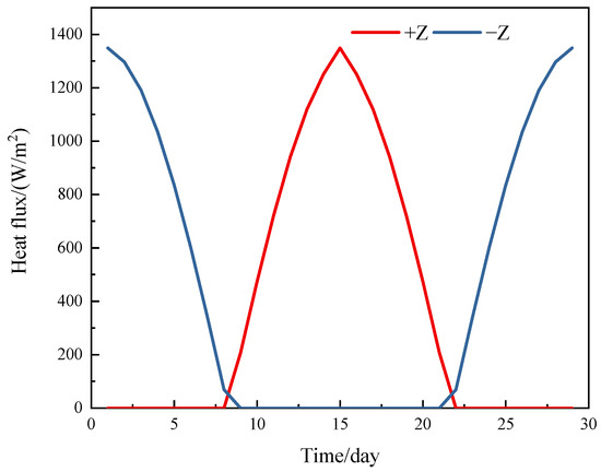 In this attitude, the +Y axis is perpendicular to the solar vector. Hence, the solar heat flux on ±Y plane is 0. From Figure 3 and Figure 4, it can be seen that the solar heat flux varies wildly. Unlike conventional orbits that operate within a single plane, the Halo orbit is a three-dimensional spatial trajectory, resulting in more complex variations in external heat flux. The orbital period of the Halo orbit is 30 days. Analysis results reveal that when the satellite maintains its pointing attitude throughout the orbital cycle, the illumination trends on the +X and −X surfaces follow identical patterns, differing only in their temporal phasing. The trends on the +Z and −Z surfaces also follow the same patterns.