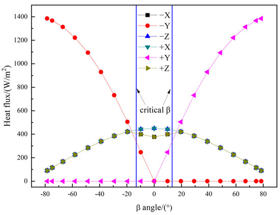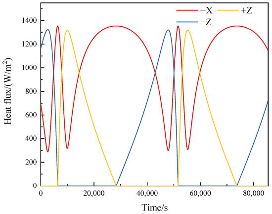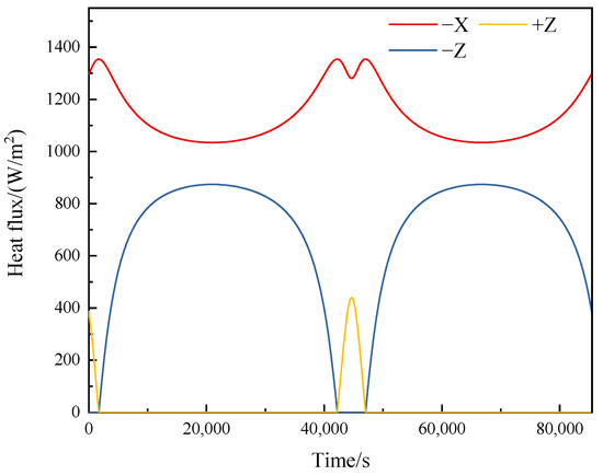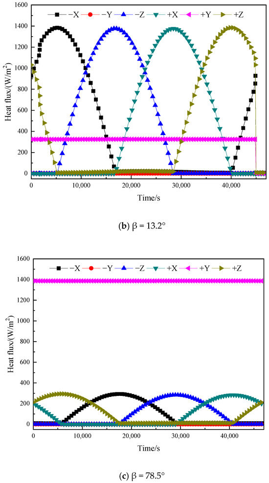 The variety of the solar heat flux on the ±Z plane and −X plane can be seen in Figure 6. When β = 0°, there will be a moment when the −X plane is perpendicular to the solar vector, and the ±Z plane is parallel to the solar vector at the same time. Therefore, the maximum solar heat flux on the −X plane is equal to the solar constant. The −Z plane and +Z plane cannot be illuminated simultaneously, but the variety of the solar heat flux is symmetrical about the sub-solar point, and the maximum is close to the solar constant.