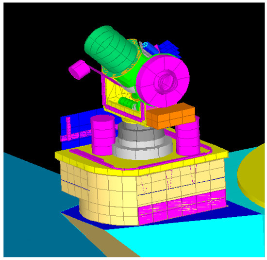 The thermal control configuration of the inter-satellite laser communication payload is as follows. White paint is applied on the telescope barrel and baffle surfaces; black paint is applied on the inner surface of the optical tube; black anodizing is adopted for primary mirror skin, secondary mirror skin, tertiary mirror skin, quaternary mirror skin, primary mirror mount, secondary mirror mount, and tertiary mirror mount. Based on these thermal control design specifications, a 3D thermal simulation model for the inter-satellite laser communication payload has been established, as shown in Figure 11. For the satellite, continuous yaw control is performed to ensure that the Sun always remains within the XOZ plane of the satellite’s body coordinate system. This means that the sunlight is always parallel to the ±Y faces of the satellite, with the +X face continuously illuminated and the −X face not illuminated. The payload’s angle tracking range is as follows: pitch from −70° to 70° within a conical angle, and azimuth from 0° to 360°.