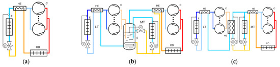 Figure 1. Refrigeration systems: (a) single-stage, (b) two-stage, (c) cascade; C—compressor, CD—condenser, E—evaporator, HE—heat exchanger, LT—low temperature stage, MT—medium temperature stage, LC—valve controller (level), TC—valve controller (temperature), S—separator of liquid refrigerant, —low temperature, —high temperature (Pack Calculation Pro software, version: v5.5.6).